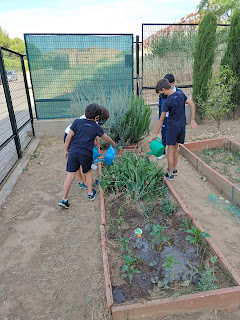 El tiempo esta semana ha cambiado y las temperaturas empiezan a ser altas, por los que los alumnos de 3º y 4º Primaria han salido a regar el huerto para que no se sequen las plantas, árboles y la siembra.