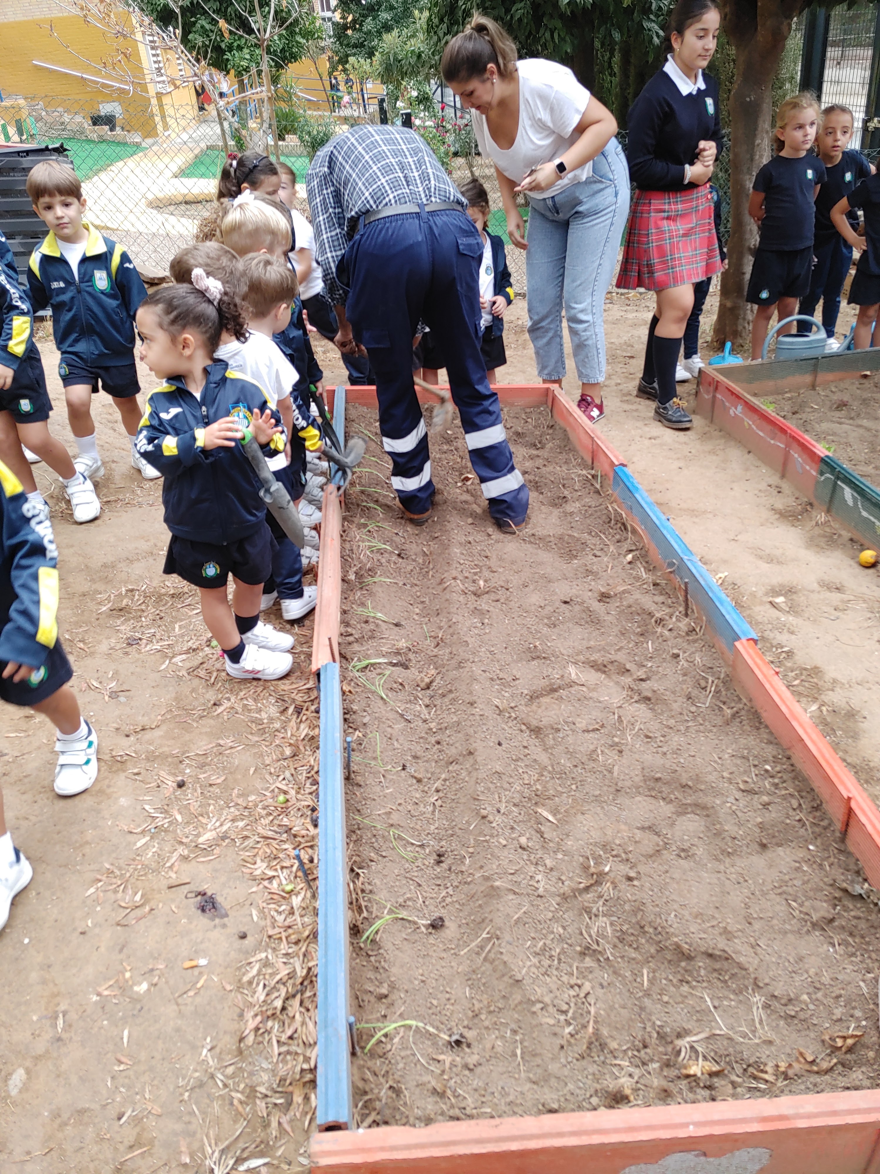 En los últimos días del mes, contamos con la colaboración de la familia de María Ruiz de 2º EPO, en la que su abuelo Rogelio nos cede plantones de cebollinos y lechugas y asiste a nuestro colegio para enseñarnos como plantarlos en los bancales, al cual asisten los 3 cursos de Infantil, que posteriormente riegan bien lo plantado, pasaron una mañana maravillosa en nuestro huerto en la que también aprendieron como se recogen las aceitunas de los olivos.